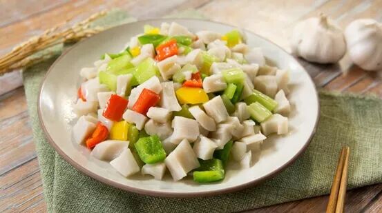 所需食材:莲藕200g,西芹200g,青椒10g,红椒10g,黄椒10g