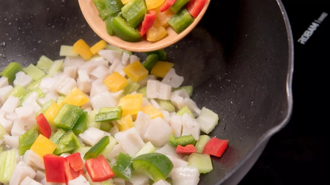 备菜准备:莲藕去皮切丁过水,西芹、青椒、红椒、黄椒切丁