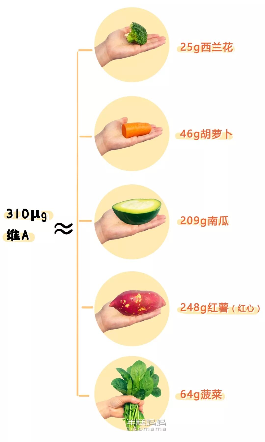 比如西兰花,就很容易做到宝宝的辅食里,310μg 的维 A 只需要 25g 西兰花就足够了,可以给宝宝做成西兰花饼、西兰花泥,也可以做成各种零食甜点。来,菜谱都给亲们准备好了 ▲点击对应图片查看菜谱