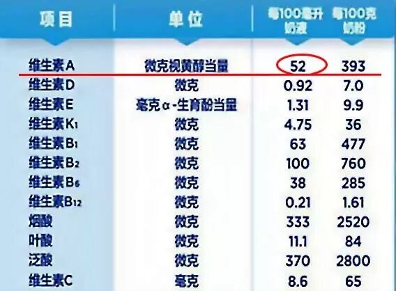 100ml 奶液约含 52μg 维 A,宝宝每天需要摄入 300μg 维 A,那么每天喝 570ml 奶液,基本不需要额外补维 A 了。不同品牌、不同段位的奶粉,维A含量会有差异,妈妈们需要自己换算哦。