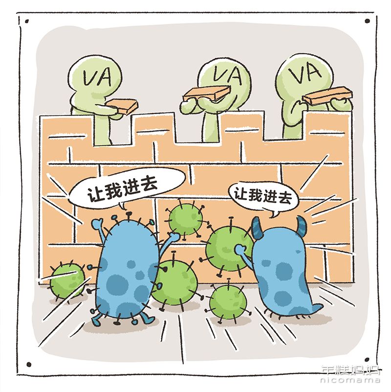 要是身体内的维 A 缺乏,呼吸道上皮细胞完整性就会受损,第一道防线就破了。如果这个时候病菌来侵犯,就容易反复发生感染。另一方面,维 A 缺乏时,身体的免疫功能也下降了,抵御病菌的军队兵力不足,也没法消灭病菌。