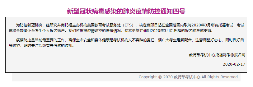 求锤得锤。前天托福也正式宣布取消中国大陆3月全部考试,考试费将全额退款至考生个人报名账户。