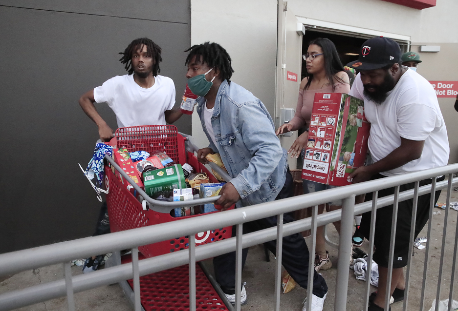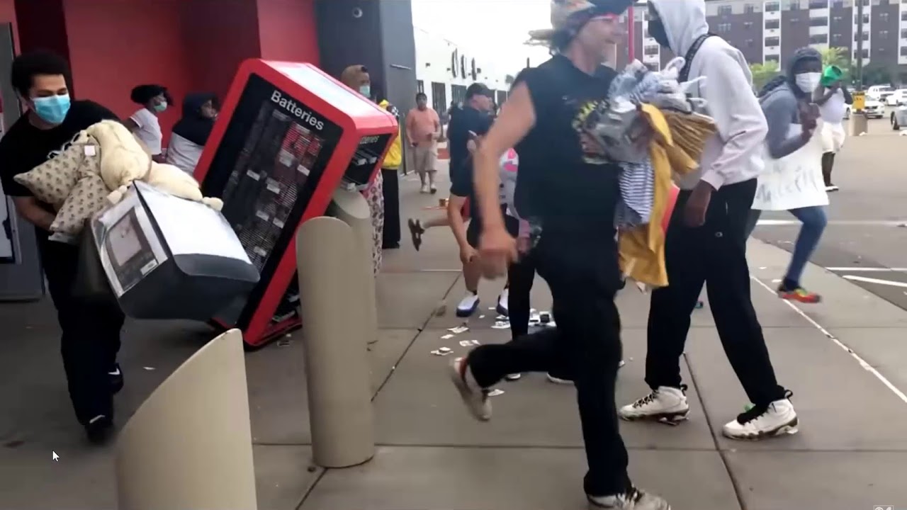 明尼阿波利斯市,一家超市遭抗议者哄抢。(视频截图)现场视频可见,超市门口聚集许多人,他们将大件小件的商品装上推车运走,还有人不断从里面跑出来,怀着抱着各种商品,小到衣服、大到电视,都没有放过。超市里一地杂物,许多货架被一扫而光。