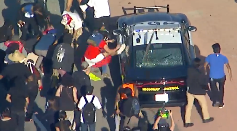 美国民众对警察暴力执法的怒火,还蔓延到了洛杉矶。当地成百上千民众走上街头示威,其中数十人将一辆正在驾驶中的警车团团包围,有人拿起滑板,砸碎车窗玻璃。还有人坐到车顶,不料被加速的警车甩飞。
