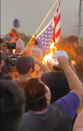 洛杉矶,有示威者焚烧美国国旗。(视频截图)在示威者中,还有人当场焚烧美国国旗。周围大批民众聚集拍照。