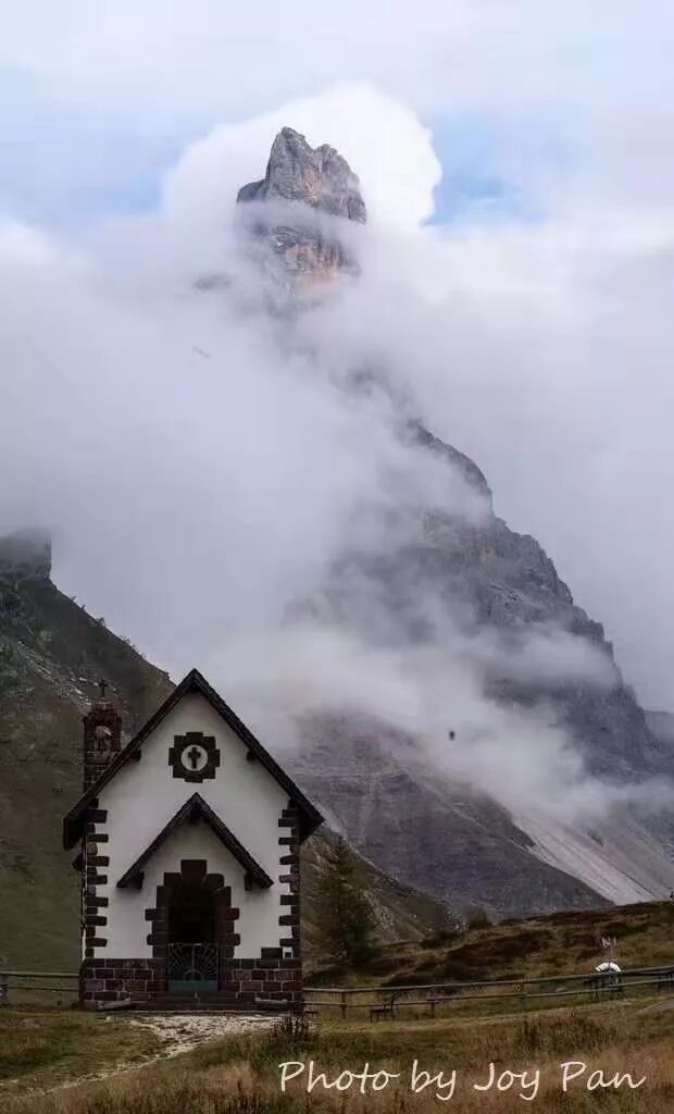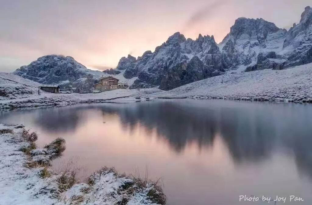 多洛米蒂采风第一站——帕索诺勒。我们入住的酒店,房间开窗就能看见一个小教堂和雨雾缭绕的山峰。稍事歇息,我们赶往拍摄地点。恰遇浓雾,回程路上极其险恶,山路弯弯,好在宣哥开车娴熟,平稳回到酒店。次日凌晨,上天开眼,一层薄雪覆盖了山峰,水中倒影时隐时现。