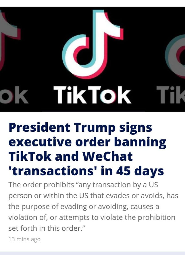 就在昨天,特朗普政府针对“Clean Network网络清洁计划”采取了进一步的行动,突然宣布签署两项总统令,称将在45天后“封杀”两大中国公司开发的手机软件——微信和 TikTok。