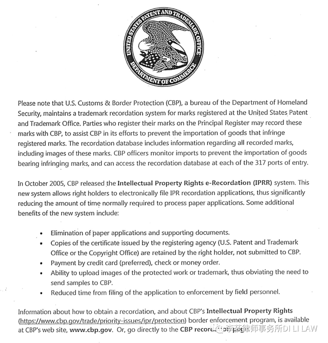 一旦商标注册申请被美国商标局USPTO批准,商标局会把商标证书寄给申请人。除了此份证书,商标局同时还会把三份不同的通知连同证书一起寄给申请人,其中就包括关于美国海关U.S. Customs & Border Protection (以下简称“CBP”) 知识产权备案的通知,具体内容如下图。那么到底什么是海关知产备案呢?备案的意义是什么?下面我们好好来聊一聊。