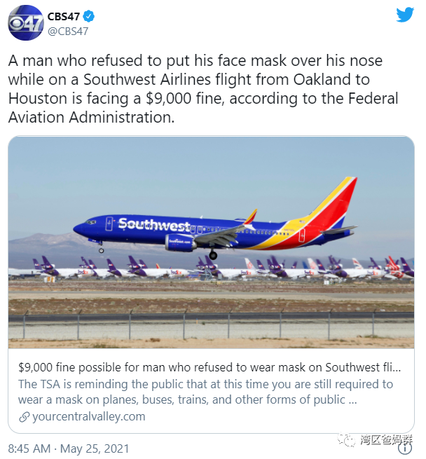 美国联邦航空总署(Federal Aviation Administration,FAA)今天表示,2月20日搭乘西南航空从湾区奥克兰(Oakland)前往休士顿(Houston)的这名乘客拒绝遵守空服员的要求,不把口罩往上拉遮住鼻子。