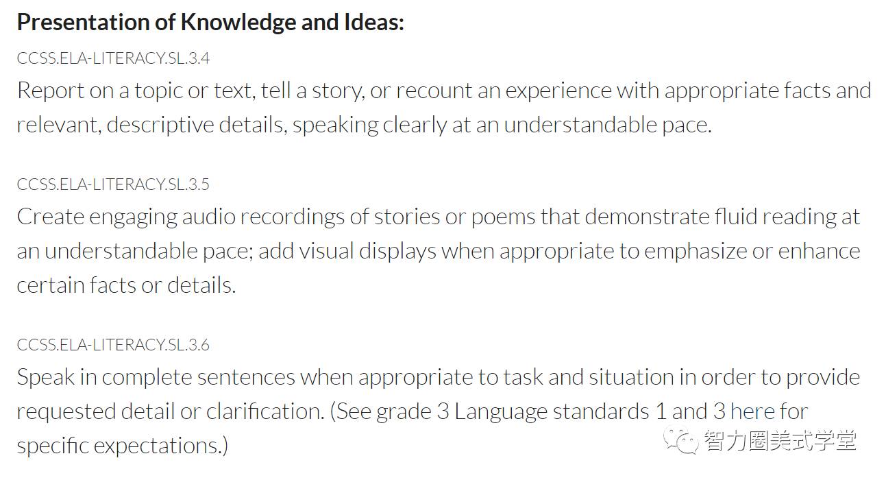 中高年级的孩子演讲要求会更高了。这个时候不仅仅是演讲技能的要求,还有语言学习的要求。在美国小学最新的通用教纲(CCSS)中,对演讲(speaking)是有不同年级有不同的要求的。以三年级的孩子为例,大纲明确要求: