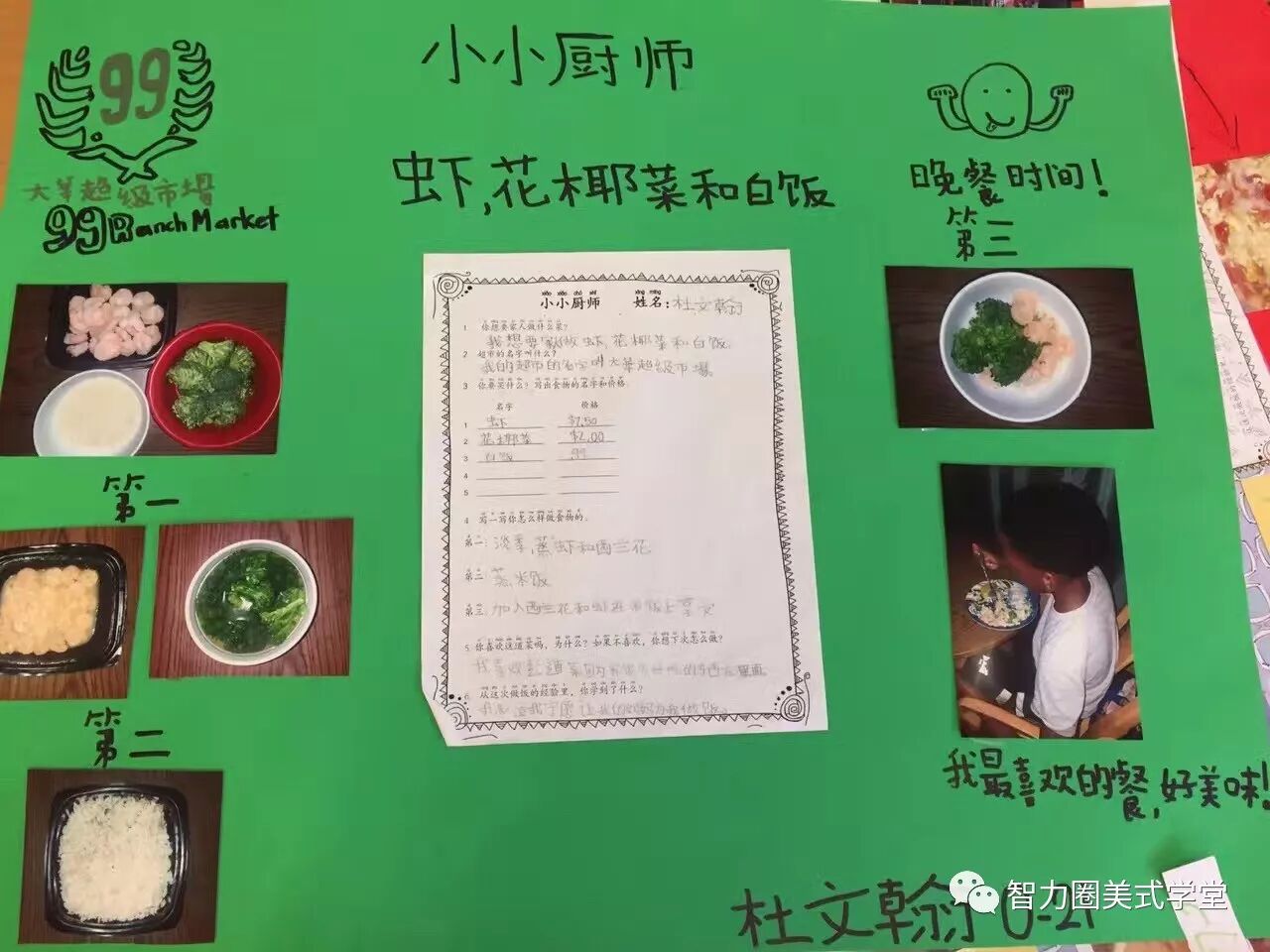 2. 很多孩子都会精心制作海报。例如我去年布置的一个演讲题目——小小厨师。要求小朋友去一个中国超市买菜并且记录下做饭的过程,最后带到学校来演讲。