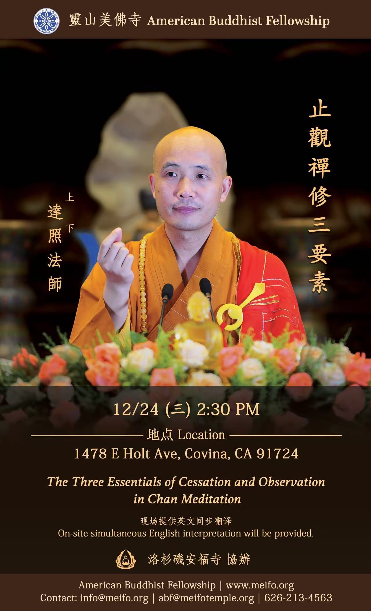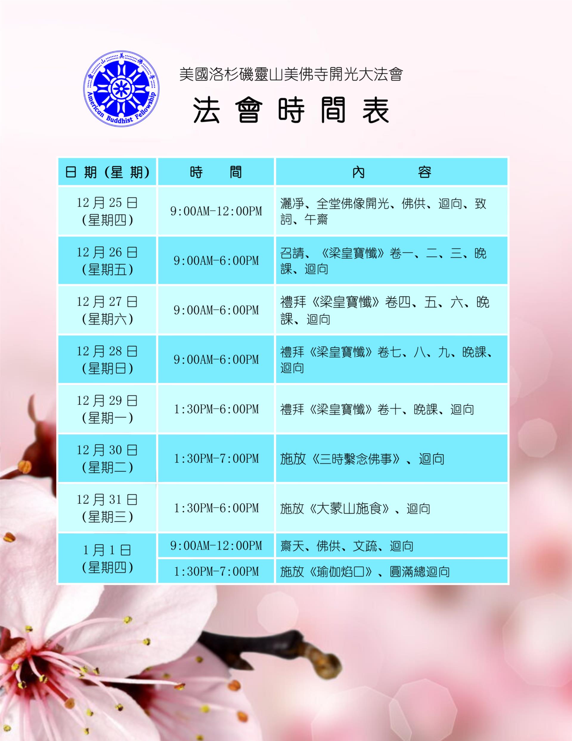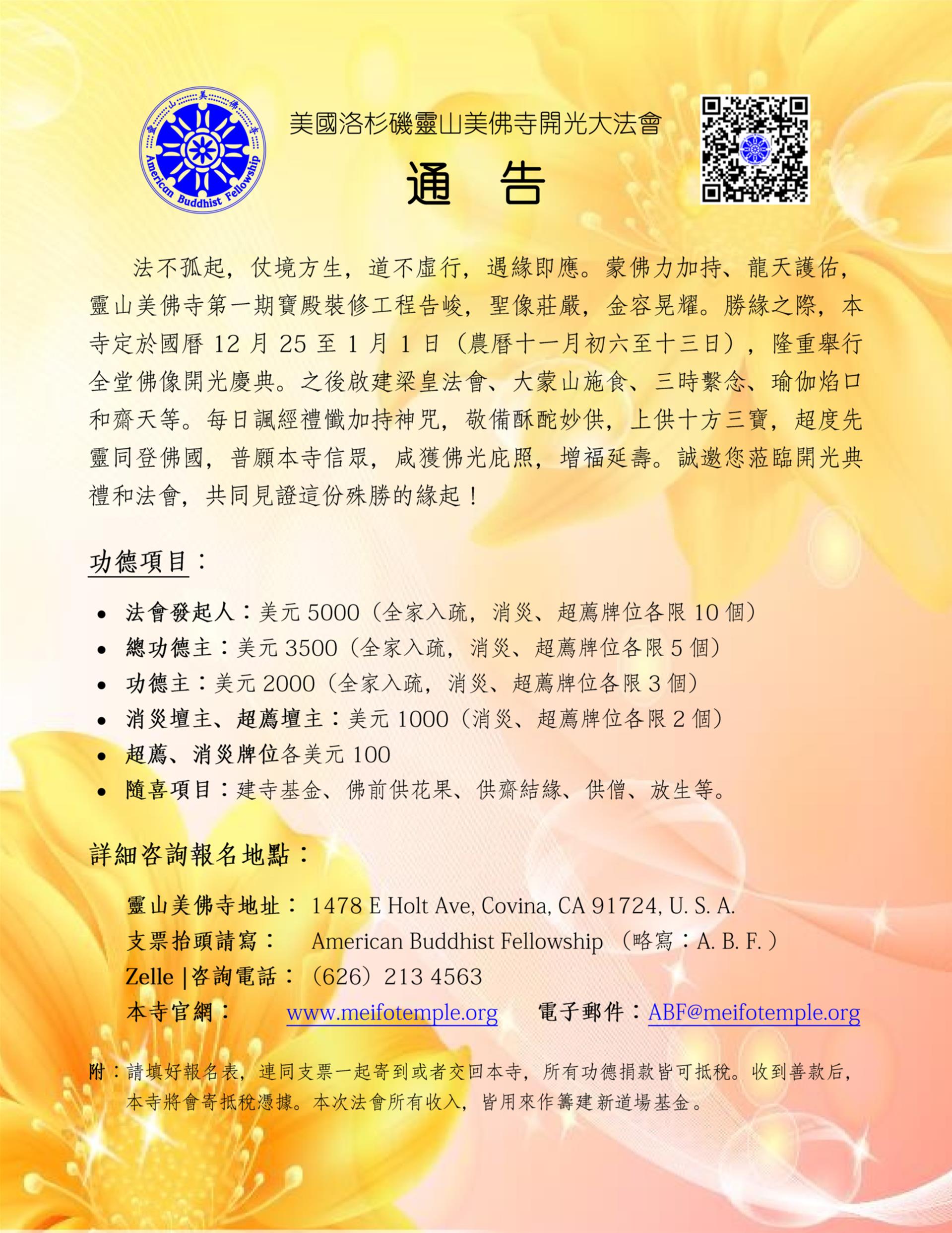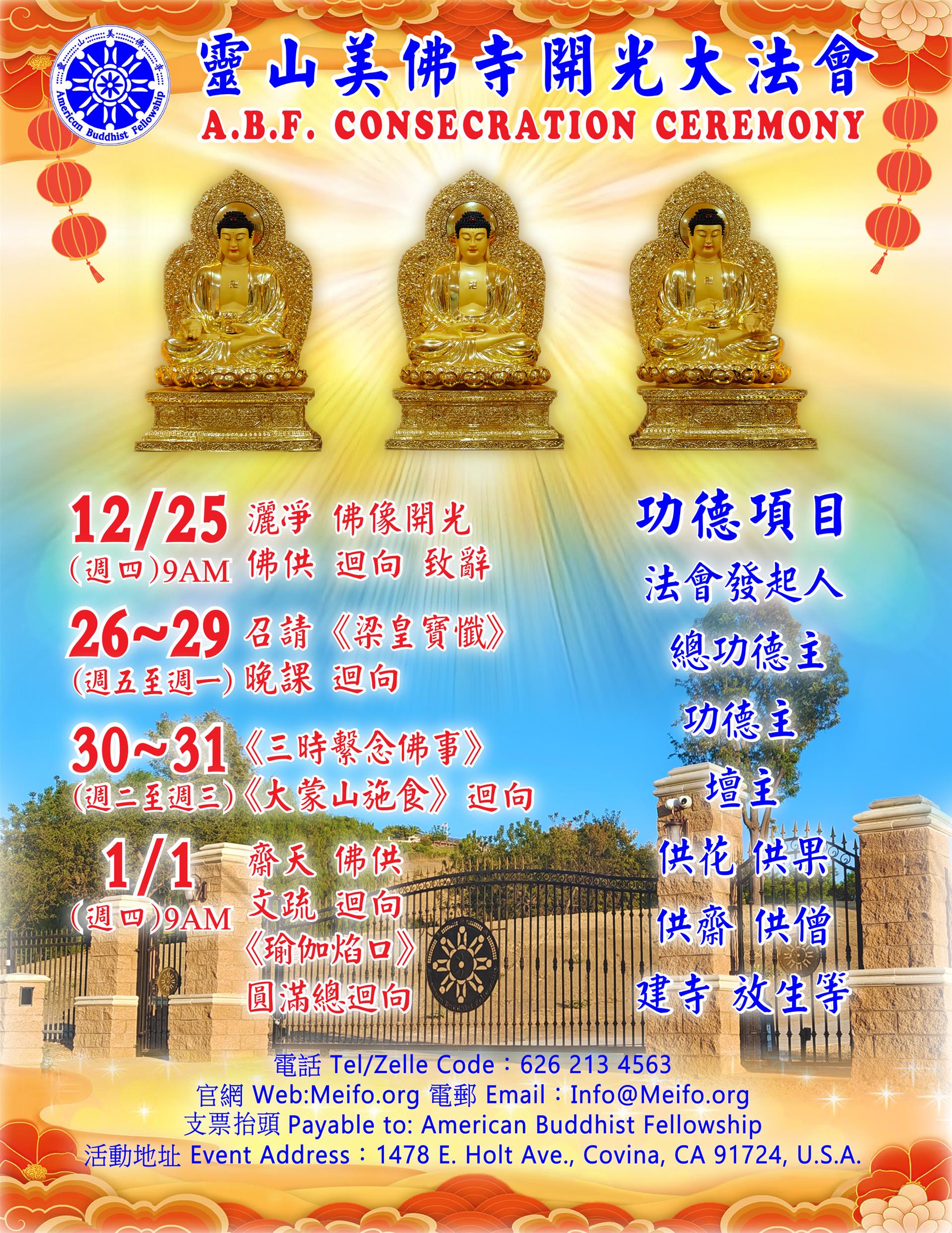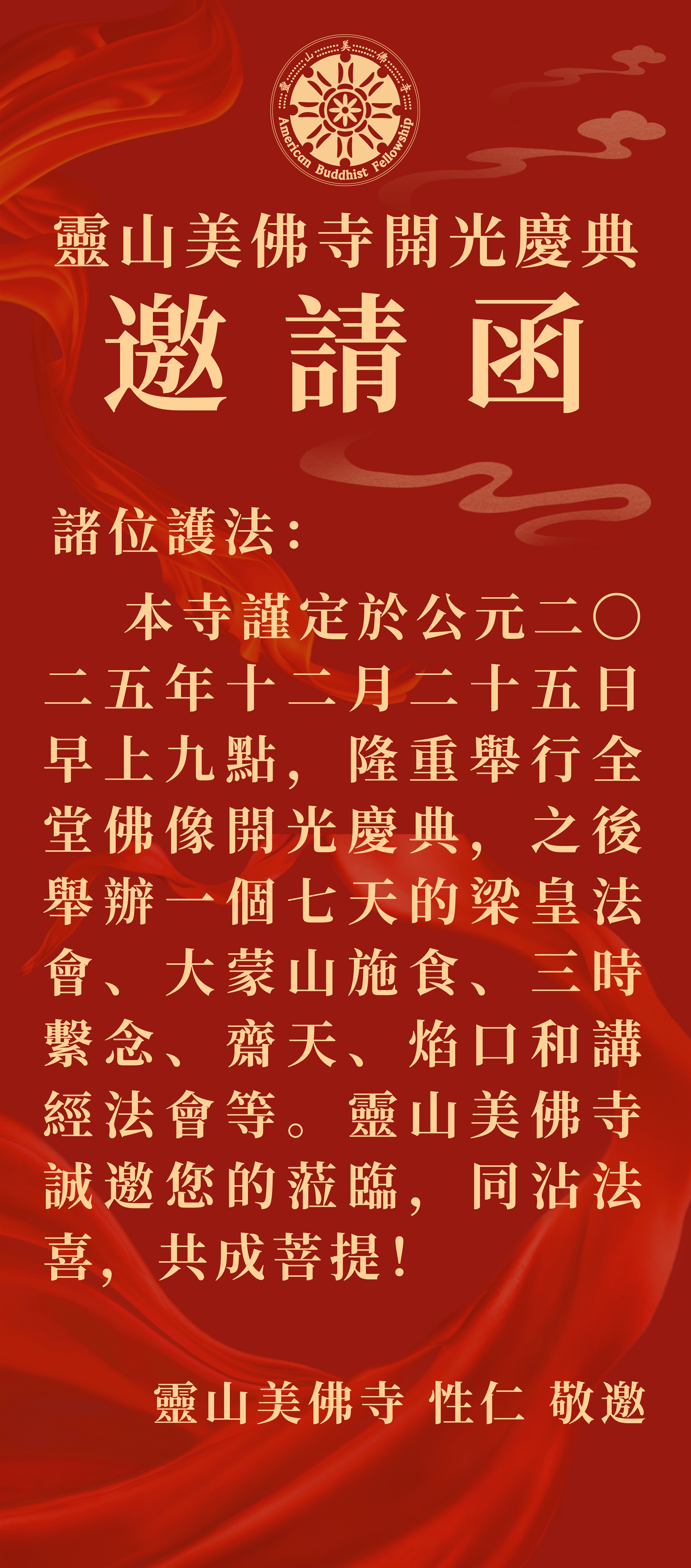 本寺谨定於公元2025年12月25日(圣诞节)早上9点隆重举行全堂佛像开光庆典,之后举办一个七天的梁皇法会、大蒙山施食、三时系念、斋天、焰口和讲经(12月24日2:30PM)法会等等。灵山美佛寺诚邀您的莅临,同沾法喜,共成菩提! 附上邀请函、法会功德项目登记和时间表等。感恩您的成就和护持,谨祝六时吉祥!阿弥陀佛!