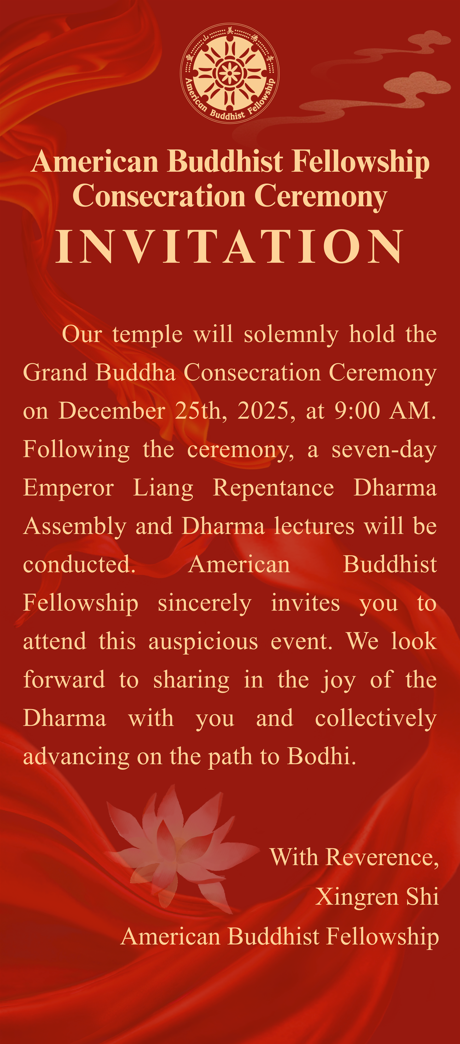 Our temple will solemnly hold the Grand Buddha Consecration Ceremony on December 25th. Following the ceremony, a seven-day Emperor Liang Repentance Dharma Assembly and lectures etc. will be held. ABF sincerely invites you to attend our ceremony. We look forward to sharing the joy of the Dharma with you and collectively attaining Bodhi!  Amitabha!