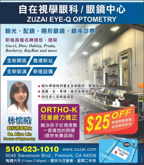 十余年成功经营眼科、眼镜的「自在视学眼科眼镜中心 Zuzai eye-Q optometry」,服务客户大众化,现客户群已有6000多位。该中心曾在世界日报主办的金冠杯中,被遴选为湾区最受欢迎的优良商家之一。 该中心服务项目包括:验光配镜、隐形眼镜、眼疾诊断、儿童视力矫正、Ortho-K儿童视力矫正、近视预防。同时代理各种名牌产品,如;Gucci、 Dior、Burberry、Versace、Prada、Ray Ban等等。 负责人林怀晴眼科视学医师毕业於加州大学洛杉矶分校,及具备德州州立眼科光学博士学位,先后任职於Palo Alto退伍军人盲人弱视中心和Kaiser Permanente光学科,经验丰富。林医师待人亲切,热心公益,经常参与义诊和社区活动,也是慈济义工。她表示:「自在视学」取名源自给与清晰自在视力的心愿,希望人人有个健康的灵魂之窗,去看光明美好的世界。 自在视学眼科眼镜中心 Zuzai eye-Q optometry 电话:510-623-1010 新址:6048 Stevenson Blvd, Fremont , CA 94538 网址:www.zuzai.com