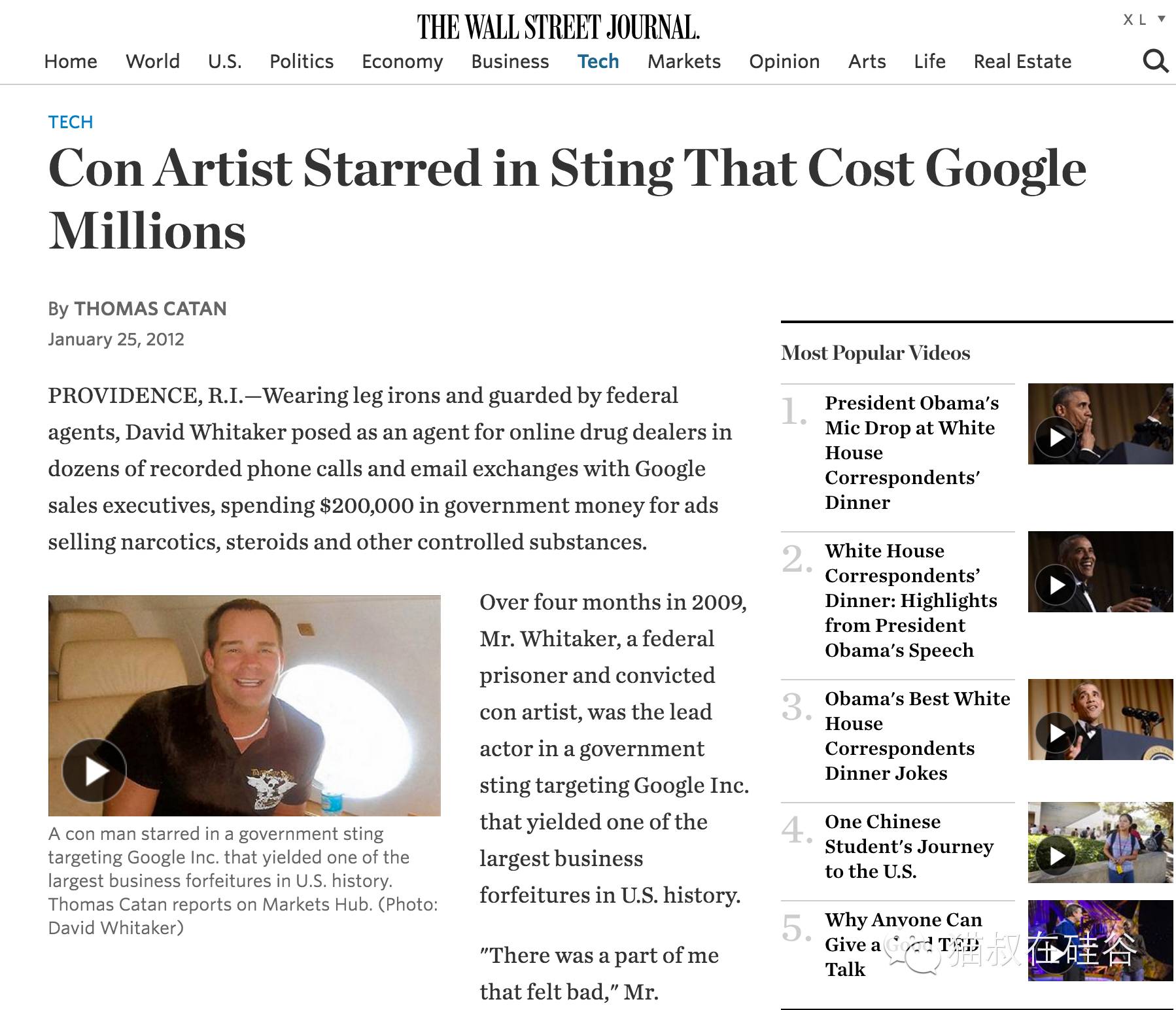 美国《华尔街日报》、《连线》等知名媒体都以《这个职业骗子让谷歌赔了5亿美元》为标题的深度报道记录了这起让谷歌颜面扫地的钓鱼式执法。惠特克最终以"重大立功表现",刑期从最初的65年减到5年时间。虽然他可以不用老死在监狱,但这个假药骗子还要面临高达1000万美元的此前假药受害者的赔偿。