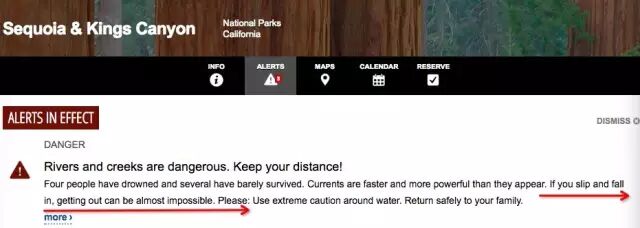 今年红杉树国家公园事故频发,官网已经发出警告:游客一定要小心河流和峡谷区域,一旦掉下去,生还的可能性极小!