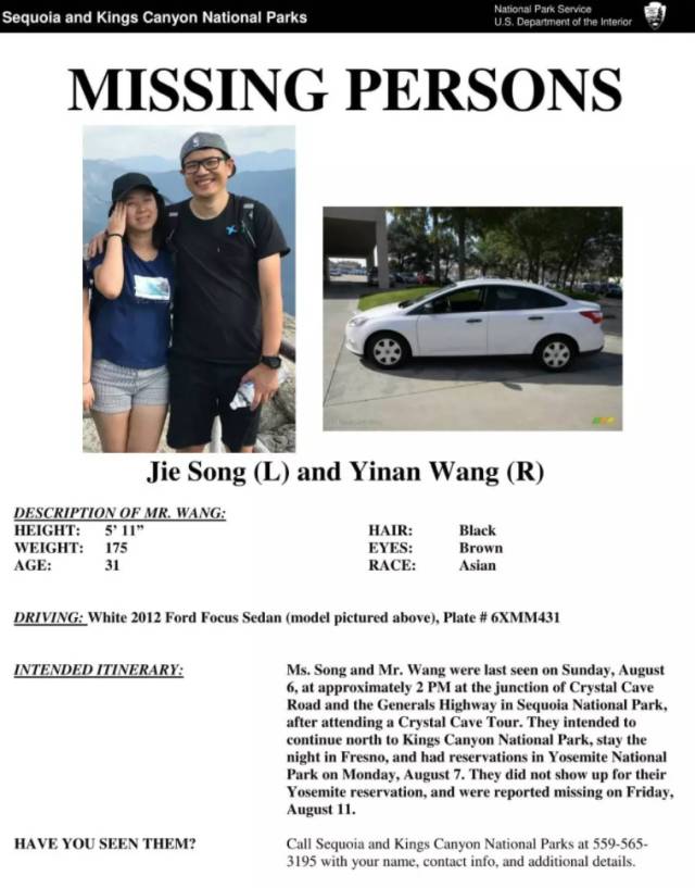 近日美国国家公园管理局发布了一则寻人启事,失踪女子名叫宋洁(Jie Song,30岁)和丈夫王一楠(Yinan Wang,31岁),两人已经失踪一周,最后一次被看到是8月6日,两人在加州的红杉国家公园Sequoia National Park参观水晶洞穴。