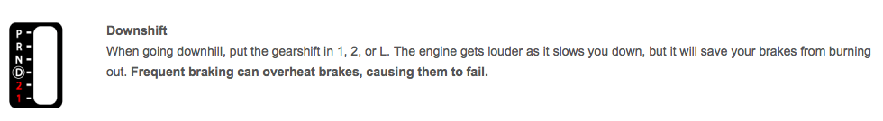 前方有较长一段下坡,记得把档位调整到1、2或者L。不要过度频繁踩刹车,否则会造成刹车失灵。
