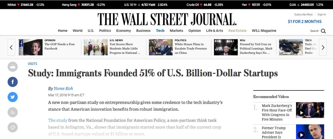 在过去的十年时间里,美国的各个城市几乎都有创业者的身影,根据华尔街日报(The Wall Street Journal)报道,美国价值10亿美金以上的初创企业都是由不在美国出生的移民创立的。