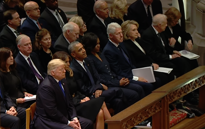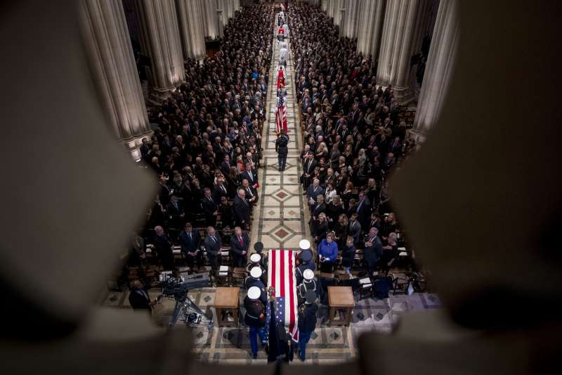 华盛顿国家大教堂的仪式上,4位致悼辞者轮番上台,依序是曾为老布希作传的史学家米契姆(Jon Meacham)、与老布希相交半世纪的前怀俄明州联邦参议员辛普森(Alan Simpson)、与老布希同时执掌国政的加拿大前总理穆隆尼(Brian Mulroney),最后压轴则是他的长子小布希。