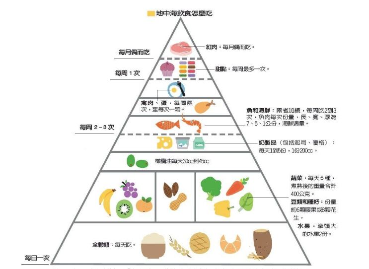 地中海式饮食,是指有利于健康的,简单、清淡以及富含营养的饮食。这种特殊的饮食结构强调多吃蔬菜、水果、鱼、海鲜、豆类、坚果类食物,其次才是谷类,并且烹饪时要用植物油(含不饱合脂肪酸)来代替动物油(含饱合脂肪酸),尤其提倡用橄榄油。