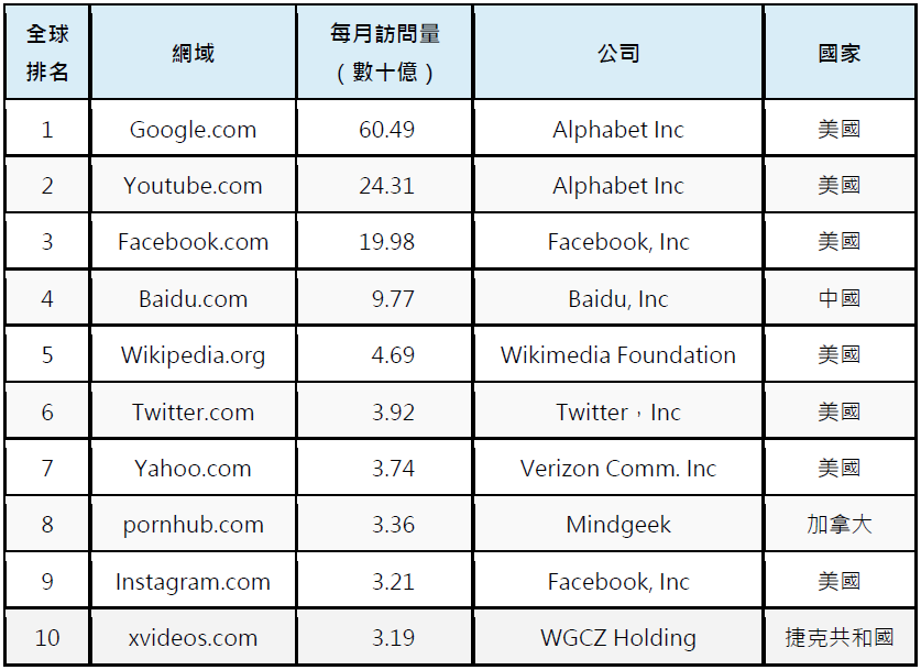 在這前十名當中,第八名與第十名的 PornHub 及 XVideos 皆為色情網站,單月流量皆超過 30 億人次,而 Instagram 則排名第九,被夾在兩個色情網站中間。
