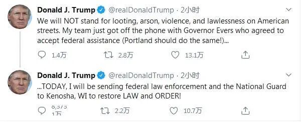 身穿防暴服的洛杉矶警察与数百名抗议者对峙。人群中有人高呼:“黑人的命也是命”和“没有正义,就没有和平”。到8月26日晚上9:30,抗议者基本上已经分散了。试图穿过人群的汽车都被民众摆出的障碍给阻塞了。晚上11点左右,暴乱人群走进位于洛杉矶第三街的隧道时,警察开始将他们围困在建筑物的两侧。没多久人群中爆发起短暂的混战,洛杉矶警察和人群推挤起来,警察迫使数十名抗议者后退挤向隧道的墙。威州乱夜,17岁小孩持枪打死2人,特朗普表示:不会容忍美国街头暴乱无法无天8月26日,特朗普发表Twitter表示:我们不会容忍美国街头的抢劫、纵火、暴乱无法无天!我们将派遣联邦执法部门和国民警卫队前往威斯康星州基诺沙市恢复法律和秩序。事情发生源于8月23日美国威斯康星州基诺沙黑人男子雅各布·布莱克(Jacob Blake)遭白人警察连开 7 枪一事,致其下半身瘫痪一事,导致黑人在当地持续爆发抗议活动。暴乱愈演愈烈,直至8月25日晚,基诺沙市街头的抗议人群中再次爆发枪击案,血洒街头。一名 17 岁的少年犯罪嫌疑人持枪打死2人,打伤1人。嫌疑犯于次日被捕。据悉,25日晚在基诺沙市街头持枪杀者是一名17岁的白人男子,持 AR-15 自动步枪,向正与警察对峙的人群开枪。并喊道:“我刚刚杀了人。”这名白人男子的行为激怒了在场所有人,每个人试图追上他,与之搏斗,这时他又开始扫射。随后警方公布信息,这名17 岁的白人男子KyleRittenhouse因涉嫌一级故意杀人罪,在伊利诺伊州被警方拘留。而嫌疑犯Kyle Rittenhouse在他的社交媒体上表示,他是一名白人警察崇拜者,他曾公开支持警察执法,参与支持警察运动“警察的命也是命 (Blue Lives Matter)”,并在脸书上发布他自己手持突击步枪的照片。