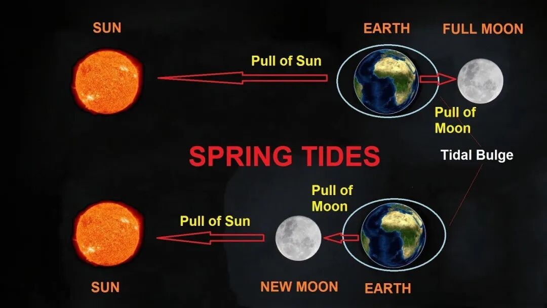 当太阳、月亮和地球处在同一个宇宙坐标直线中、月亮与地球距离最近时,星体对地球的引力大大增强。引力直接作用在海洋潮流当中,掀起巨浪。