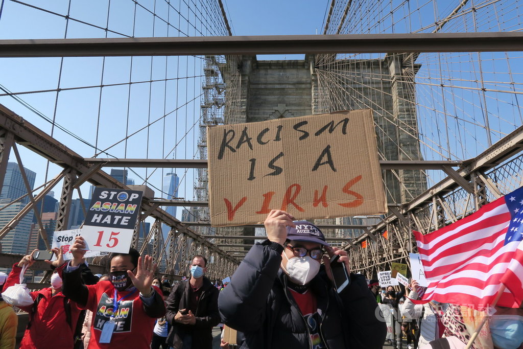 美国2019冠状病毒疾病期间仇恨犯罪盛行,今天纽约万人上街怒吼「停止仇恨亚裔」,地标布鲁克林大桥车道挤满人群。亚裔展现团结气势,催出纽约近一年来规模最大游行。
