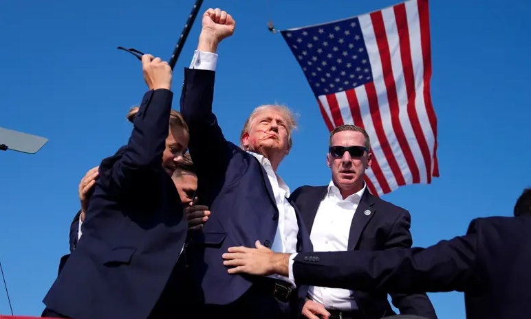 川普13日在宾州巴特勒县(Butler County)的一场选举集会上遭遇枪击,从美媒和社群平台流传的现场画面可看到,川普在台上发言时突然枪声大作,川普随即摀住右耳,并蹲低下趴,身旁多名特勤局(The Secret Service)人员涌上前保护川普。