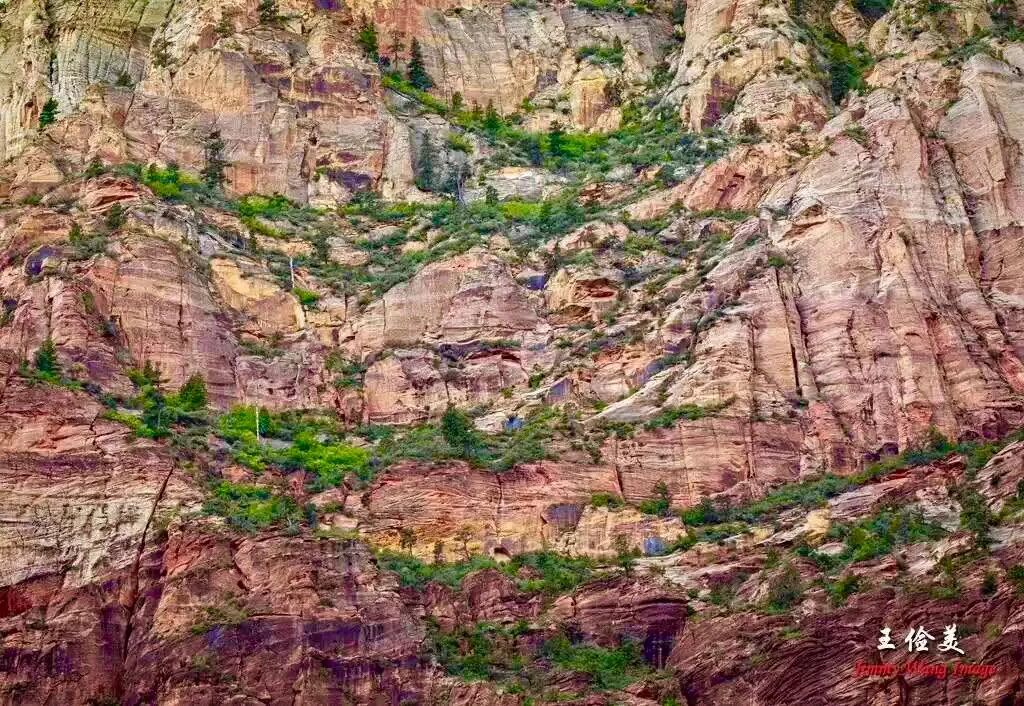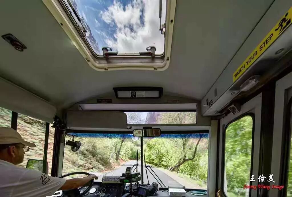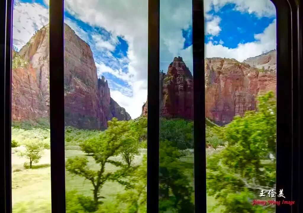 第二天一早,先到锡安公园,坐Shuttle到里面转了一圈,沿途拍了些景点。这是一座气势恢宏的大峡谷,陡峭的绝壁几乎有900多米高,其间交替出现巨大的扶壁、塌陷的凹龛、深邃的峡谷与平坦的石坪。
