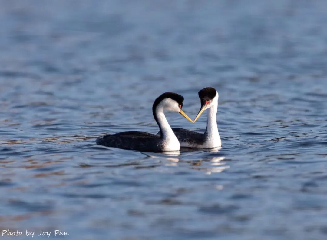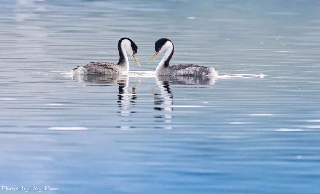 2020年1月14日,天蒙蒙亮,我开车去公司附近的公园想拍晨光下的雪山倒影。再公园门口,只见一辆小车卸下两个女生,看她们的装备,我就知道是来摄影的。女生扛着大包走到湖边,同时,我的车绕道进来,在湖边观望一下,没有我期望中的平静雪山倒影,正想掉头就走,只见两个女生朝我走来。我让她们坐进我的车子取暖,了解到她们是专程从国内来洛杉矶,拍几种独门鸟类的,包括西鸊鷈,在这个湖边已守候四天。