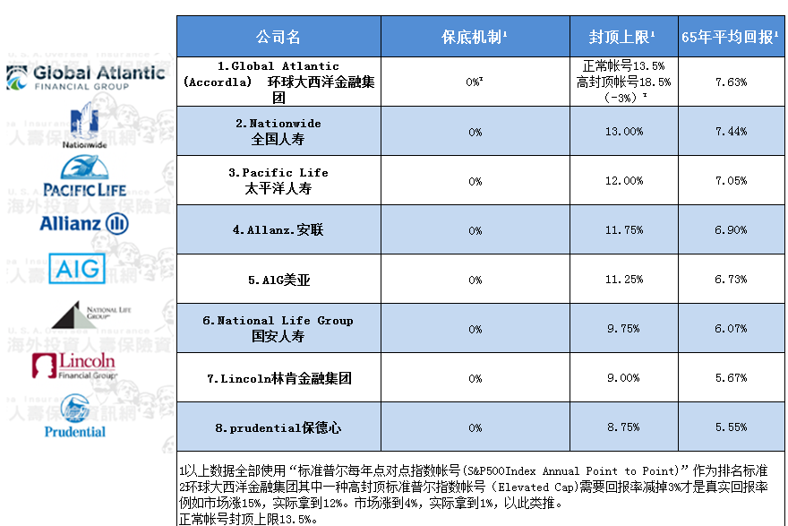 以下是比较常使用的9家指数型万能险公司比较(环球大西洋金融集团、全国人寿、太平洋人寿、安联、美亚、国家人寿、林肯金融集团、保德信),全部使用标准普尔每年点对点指数账号: