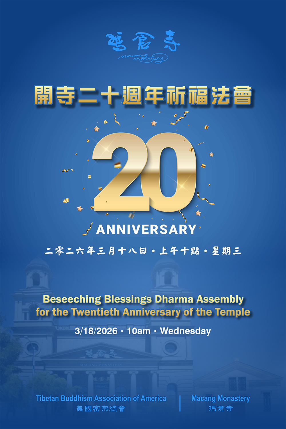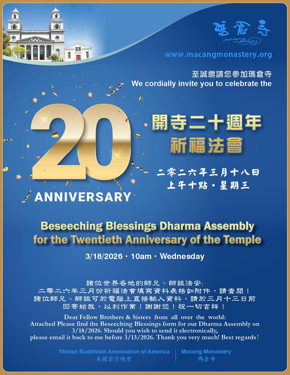 玛仓寺将於3月18日(周三)上午10时隆重举办开寺20周年殊胜祈福法会,欢迎十方佛子善信踊跃参加,法喜充满,祈福消灾,积善余庆。