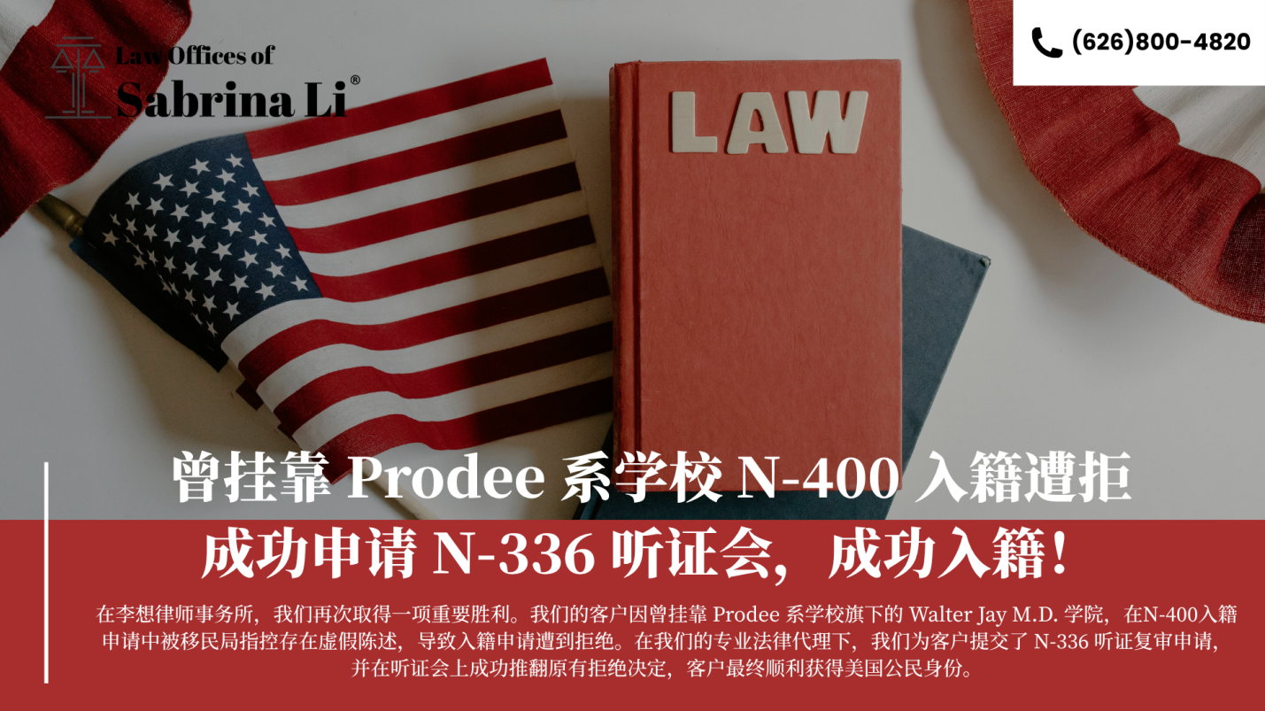 在李想律师事务所,我们再次取得一项重要胜利。我们的客户因曾挂靠 Prodee 系学校旗下的 Walter Jay M.D. 学院,在N-400入籍申请中被移民局指控存在虚假陈述,导致入籍申请遭到拒绝。在我们的专业法律代理下,我们为客户提交了 N-336 听证复审申请,并在听证会上成功推翻原有拒绝决定,客户最终顺利获得美国公民身份。