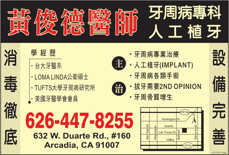 黄俊德牙医师/HWANG, STEVEN JIUNN-DER, D.D.S., M.P.H.专精於牙周病专科,人工植牙,牙科医生。黄俊德牙医师/HWANG, STEVEN JIUNN-DER, D.D.S., M.P.H.的办公地址在632 W. Duarte Rd., #160, Arcadia, CA, 91007,公司电话是(626) 447-8255,公司营业时间MON-SAT(10-12,2-6)该商家的关键词包含:牙周病医生 牙周病 牙周病 人工植牙 牙冠增长牙龈移植 牙周组织再生 牙周组织再生牙龈齿槽骨修整 拔牙 洗牙 蛀牙填补 补牙假牙 根管治疗 牙齿美白 牙齿漂白 牙医专科 牙齿专科 植牙专科 牙周病专科牙周治疗 牙龈 植牙专科一般牙科 人工植牙 人工植牙专科 牙齿美容牙齿美白 成人牙科 齿列矫正 牙齿矫正牙周病 牙周病 洗牙 拔牙 蛀牙 牙套 牙冠根管治疗 拔智齿 口腔科 南加州牙医 口腔外科固定假牙 活动假牙 口腔癌 牙齿整形 补牙牙科医师 牙科诊所 亚凯迪亚人工植牙 亚凯迪亚牙周病医师 牙周病专科 人工植牙专科