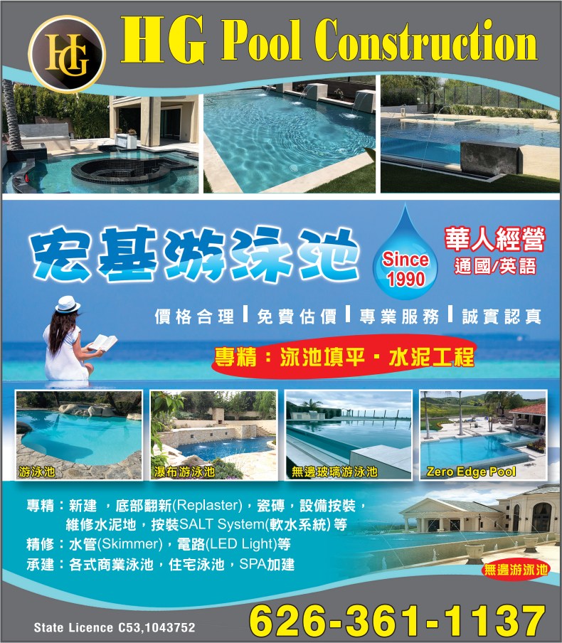 宏基游泳池建造公司/HG GLOBAL CONSTRUCTION 专精於游泳池建造工程,游泳池清洁保养。宏基游泳池建造公司/HG GLOBAL CONSTRUCTION 公司电话是(626) 361-1137,公司营业时间MON-FRI(8-6)他们的网站是www.ccpoolandspa.com。该商家的关键词包含:新建泳池 泳池服务 Swimming-pool-construction