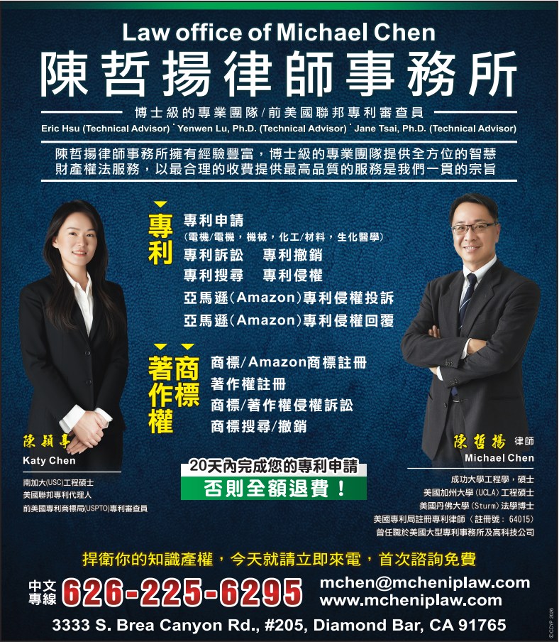 陈哲扬律师事务所/CHEN, MICHAEL, ATTORNEY AT LAW专精於律师,律师-商业法,律师-专利权‧商标权及版权法。陈哲扬律师事务所/CHEN, MICHAEL, ATTORNEY AT LAW的办公地址在3333 S. Brea Canyon Rd., #205, Diamond Bar, CA, 91765,公司电话是(626) 225-6295,公司营业时间MON-FRI(9-6)他们的网站是www.mcheniplaw.com。该商家的关键词包含:专利申请 专利诉讼 专利搜寻 专利覆审 专利侵权分析 商标注册律师 版权注册 版权侵权 商标侵权 商标诉讼 版权诉讼 商标搜寻 品牌注册 华明胜律师事务所陈哲扬律师 华明胜律师事务所 陈哲扬律师 工商律师 Green-Card 专利律师 版权律师 专利 版权 商标 美国专利申请 美国着作权申请 美国商标申请 商标申请洛杉矶 专利申请洛杉矶 着作权申请洛杉矶 美国亚马逊专利诉讼