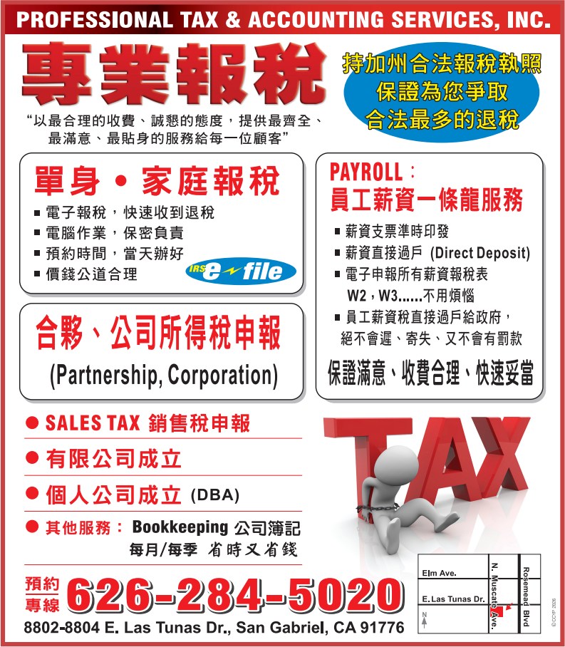 专业报税/PROFESSIONAL TAX & ACCOUNTING SERVICES INC.专精於会计师‧会计服务,报税服务。专业报税/PROFESSIONAL TAX & ACCOUNTING SERVICES INC.的办公地址在8802-8804 E. Las Tunas Dr., San Gabriel, CA, 91776,公司电话是(626) 284-5020,公司营业时间MON-FRI(11-6)该商家的关键词包含:太阳城广场 Sunny Plaza 个人报税 家庭报税 退税 公司报税 公司合夥 公司成立 DBA 公司所得申报 员工支票 员工薪资支票 报税表 W2 W3 销售税申报 簿记 Bookkeeping 电子报税 IRS E File