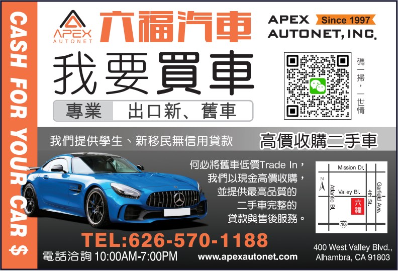 六福汽车/APEX AUTONET, INC.专精於汽车经销商及汽车租赁。六福汽车/APEX AUTONET, INC.的办公地址在400 W. Valley Blvd., Alhambra, CA, 91803,公司电话是(626) 570-1188,公司营业时间MON-SAT(10-7)他们的网站是www.apexautonet.com。该商家的关键词包含:新车 二手车 中古车 旧车 买车 卖车 租车 豪车 房车 轿车 跑车 SUV 休旅车 油电混合车 摩托车